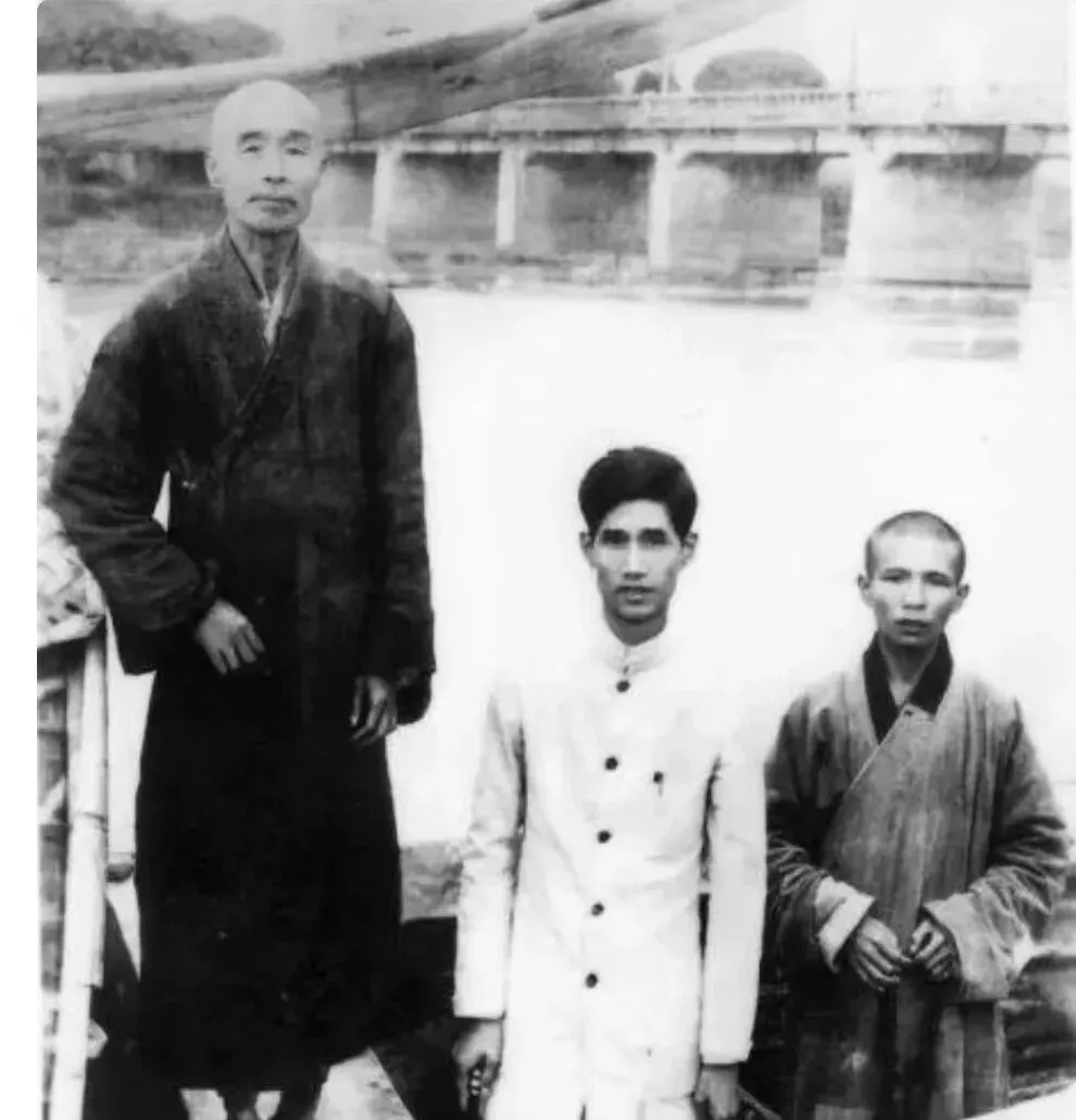 这张河边照里,桥栏像一条白线把背景划开,左边那位僧人站得直,右边的青年把手缩在袖里,水面灰白,像一面起皱的镜子,这种渡口照,过去是一家人的记号,现在成了陌生人的眼福。