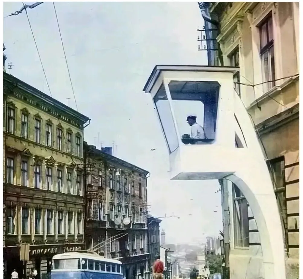 图中这玩意儿是高位交通岗亭,像一只白鹭探出头去,交警坐在玻璃舱里看四方,电车拉着线从坡下喘上来,风把帽檐吹得有点斜,这玩意儿现在少见了,路口都靠红绿灯,可我还是喜欢有人指挥,吹哨子的时候,节奏就有了。