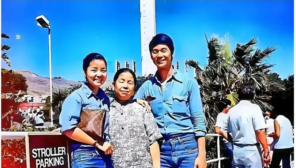 这张蓝天底下的合影叫在外游玩,牛仔衫配牛仔裤,手臂搭在母亲肩上,手里拎着一只旧皮包,背景里的人影都是白色碎点,太阳晒得人眯起眼,姑姑当年寄回家一张明信片,说天再高也挡不住想家的心,这句我记到现在。