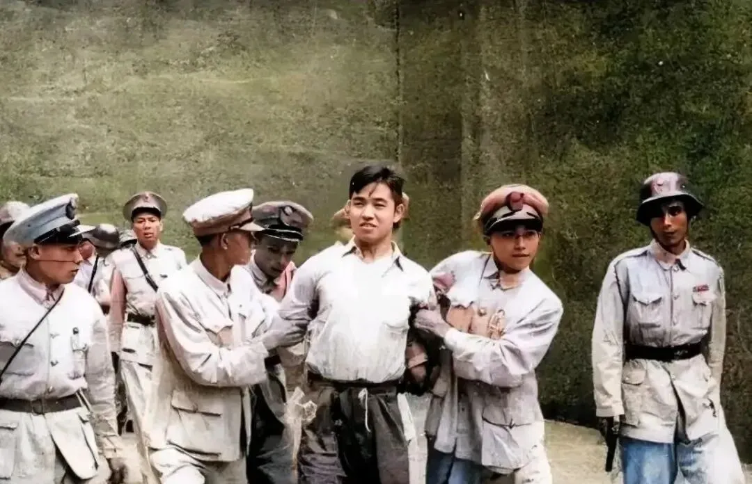 画面里这位青年被押着,嘴角有点倔强的弧,制服上的纽扣反着亮,墙体的苔色把人都衬得更硬,旁边的脚步都在赶,只有他不慌,照片会说话,谁更像站在光里,一眼能看出来。