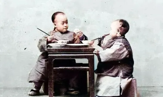 图中这小方桌叫八仙小桌,四条直腿,桌面铺着旧漆,边角有磨痕,两位男孩儿穿着长衫棉马甲,袖口肥肥的,筷子比现在长一截,夹起个馒头要抻着胳膊才够得着,桌下还露着一双布棉鞋,鞋面起了褶子,家里若是来客,这一桌再垫个高凳,碗一挪就凑成席面了。