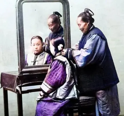 这套东西叫梳洗台,木质梳妆镜外沿一圈细密的挤纹,老式榫卯架住镜面,坐着的小姑娘发缝分得直,后脑勺贴着油光,旁边的长辫子盘起一圈又一圈,妈妈看着照片说,这种镜子最怕潮,一潮木头就变形,照人会虚,人倒实在,镜子却“飘”,可不就这味儿吗。