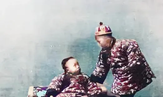 他穿的蓝坎肩是旧粗布做的,面上起了霜白的磨痕,里层棉絮厚,最外层的瓜皮帽紧紧扣住,手里那个细长玩意儿像是果子或者干粮,孩子抬头盯着看,嘴角抿着,像在等一口,爸爸把零嘴贴在嘴边试温,这点小心思,隔着一百年都能懂。