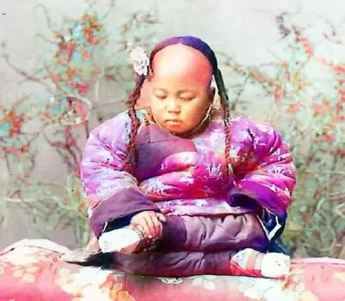 这个发式就叫高发际,前额推上去老高,左右各垂小辫,脸蛋被棉袄领子衬得更圆,手里攥着纸卷,眼睛半眯,像是刚睡醒,若在戏里早给你补两撮刘海,现实里可没那闲工夫,梳一回头能顶三天,不爱散就算赢。