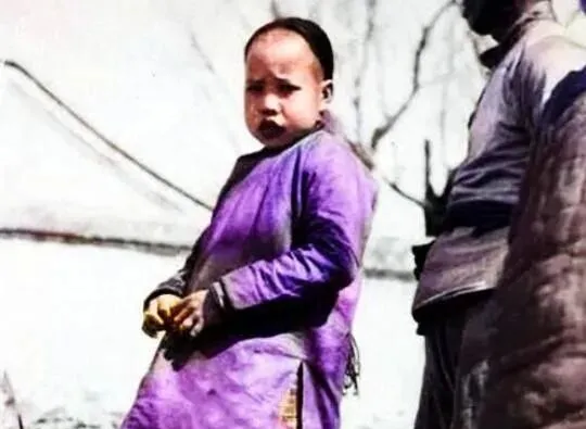这件紫色长袍里头多半还绑着个“抱肚”,前襟鼓出小小一块,腰间勒痕明显,孩子侧着身,手里攥着个黄澄澄的果子,脸被北风吹得鼓鼓的,村口要是刮沙,衣摆一甩,尘土全粘在下摆,洗也不好洗,穿脏了照穿,谁管颜色搭不搭。
