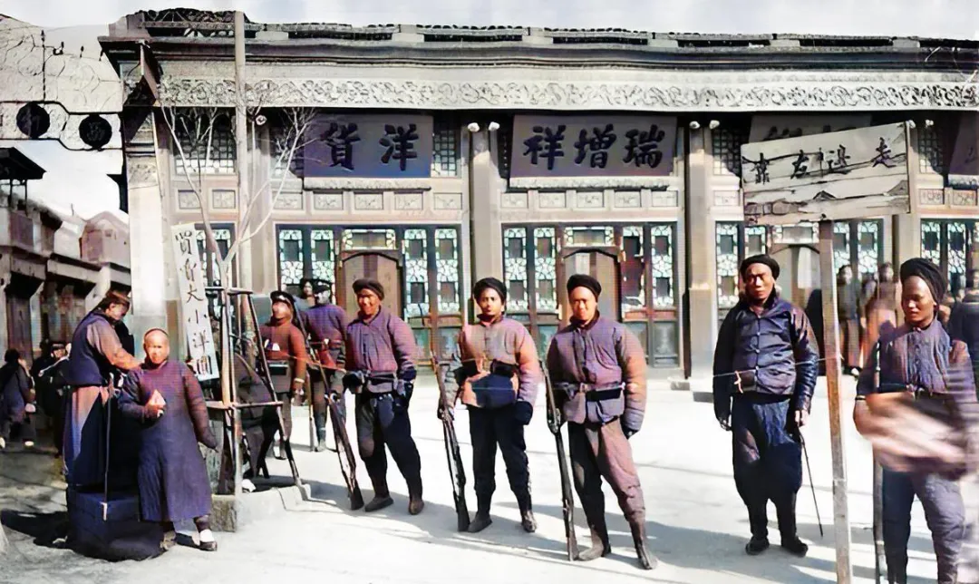 图里这些兵丁的长杆火枪和红缨帽最扎眼,枪托漆黑发亮,肩头绒布棉袄鼓鼓的,门匾上“瑞增祥”三个大字压着一条街的体面,木牌写着“靠左边走”,这就是规矩,兵丁们站成一溜,腰间配盒挎着,眼神不虚,店里做的是细腻买卖,门口却得靠硬家伙镇着气儿,以前逛街见巡逻的保安,心里也会下意识往边上一挪,时代换了身行头,维持秩序这点没变。