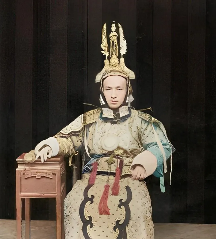 这个硬邦邦的行头叫明光甲一类的礼仪甲,金盔高挑,正中竖着饰片,胸口一枚圆护心镜,腰间坠彩穗,甲片一片片压着,像鱼鳞似的贴服在身,坐姿端正,手靠小案,别管是不是上朝值守,当时在紫禁城里穿上它就代表职责和体面,奶奶见到我看戏装照时打趣说,别看亮堂,这玩意儿沉,站久了腿肚子直抖。