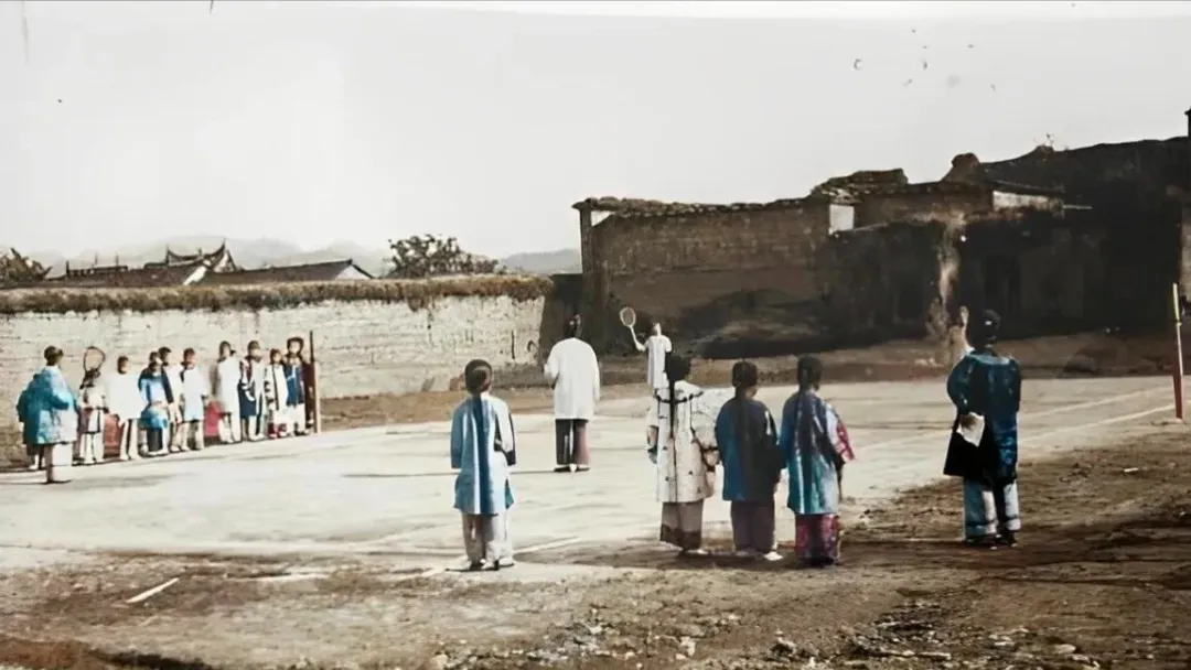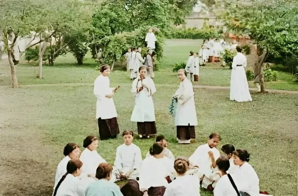 这片绿茵就是女学的操场,白衫黑裙的学生围坐成圈,手里捏着团扇、花枝,老师站在中间说话不急不躁,风一吹,衣角微微起伏,照片里是香气和书声都能看见的颜色,以前女孩子能这样堂堂正正念书不容易,妈妈说她学生时代也爱在树荫底下背课文,惹得蚂蚁爬上凉鞋都懒得赶。