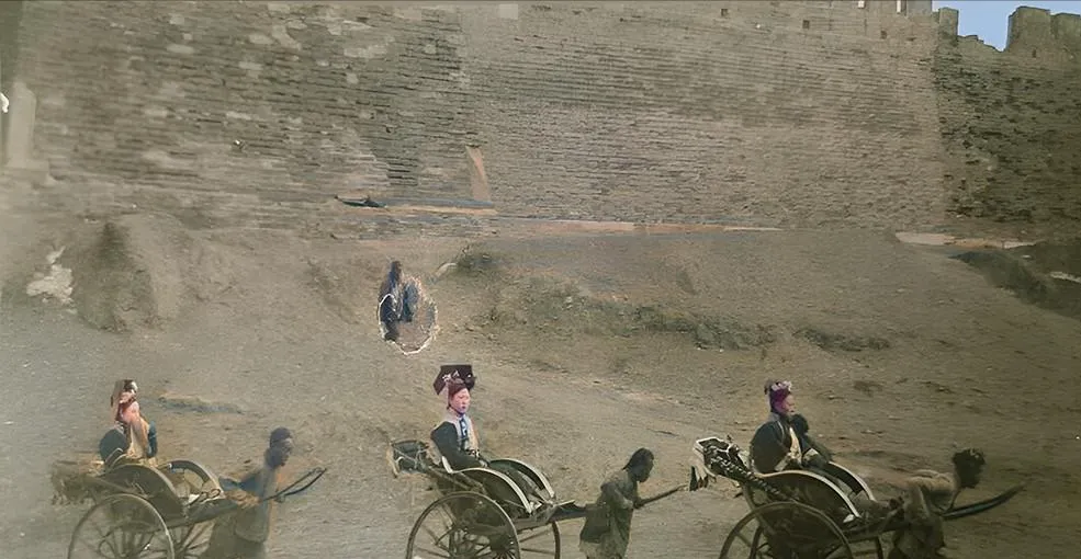 这辆双把手的小车就是人力车,窄轮高辕,扶手包着布,前面的人弓着背,后座靠垫用锦缎包着,格格坐得直,头上花钿晃一晃,尘土跟着车轮打着旋儿,路边人让开一条细道儿,车夫抹一把汗继续跑,现在城里共享单车到处都是,自己一蹬就走,那会儿腿脚就是马达,靠的是饭劲儿。