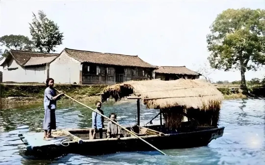 这个遮阴的船棚叫篷船,篷顶糯黄,船舷抹黑油,篙一戳水便开了道,把水面劈成两瓣,船头一只竹篓,船尾一只铁锅,少年站在中舱看岸边,女人撑篙脚趾抓着船板,河道弯一弯,屋檐倒影就跟着晃,小时候去外婆家坐过木船,浪一来,心也一沉一浮,岸上有人喊几句家常,声音顺着水传得远。