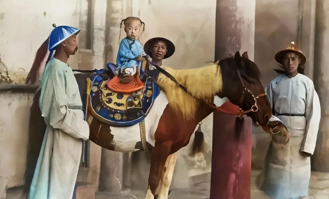 这副华丽玩意儿叫官样鞍具,鞍桥凸起,垫毯绣着团寿纹,缀金片和流苏一层又一层,小娃坐上去脚够不着镫,旁边大人一手扶着后腰一手握缰,厩夫的斗笠在日头下泛光,马是花背短鬃,鼻盔扣得稳,孩子回头看镜头,眼睛亮晶晶的,家里人笑着说,别怕,坐稳了,拍完照给你糖,现在想想,一张老照片就把童年的威风定住了。