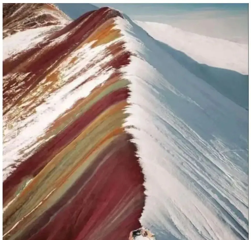图里的彩色山脊叫七彩山,岩层像切开的千层糕,一层红一层绿再叠着白雪,风一吹雪粉顺坡滑下去,露出矿物染过的条带,远远看像有人拿大刷子在山上刷了几道漆,以前地理课本上一张小图带过,现在放大了看细纹,才知道自然的手可真细。