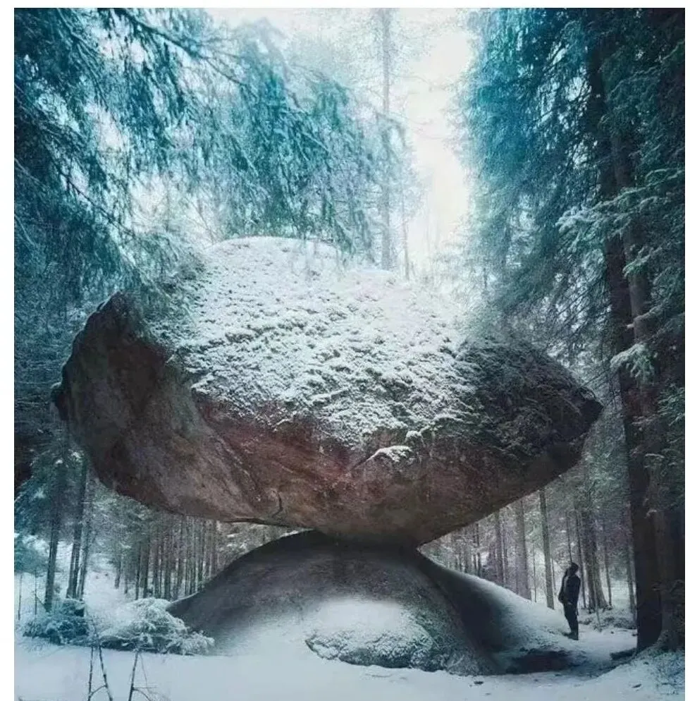 这个大石头在雪林里翘着,名字叫平衡石,上面一块像巨龟,下面垫着小一号的圆石,俩家伙轻轻一碰就像要挪窝,其实稳得很,树枝上落雪,风把针叶吹得哗啦啦响,人一站到旁边就成了尺,才知道自然的尺度从不照顾我们的常识。