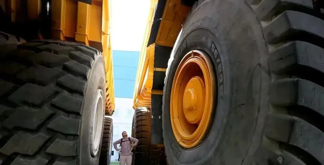 这个橘黄色的庞然车叫矿用自卸卡车,轮胎比人还高,胎纹一块一块像面包片,人在底盘中间抬头看,车厢边梁压得天都窄了,司机爬上驾驶室得拎着扶手台阶一级一级上去,以前我们拿四驱小车疯跑,现在真车一发动,地面都会嗡嗡作响。
