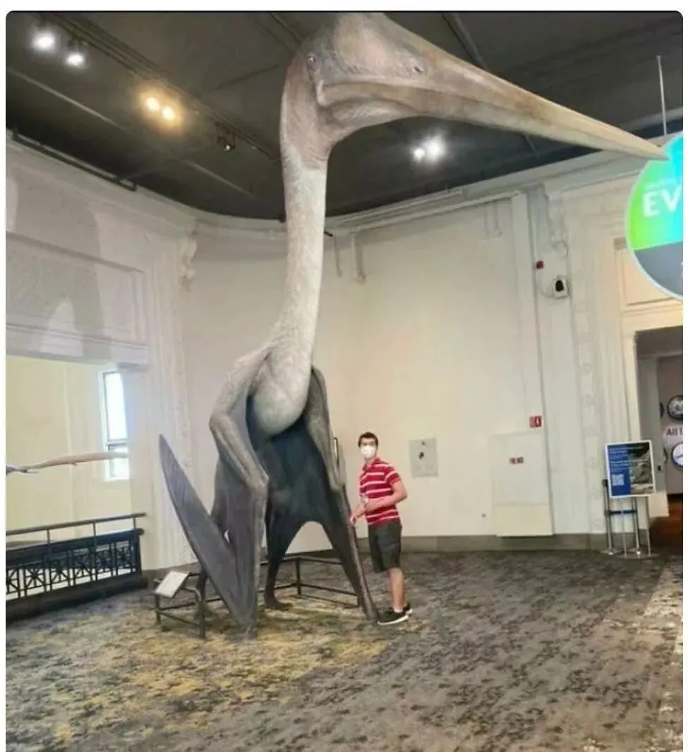 这只高个儿是翼龙的复原,脖子像长鞭,前肢撑地后肢收着,喙尖得能挑起一枚硬币,站到人旁边完全是另一个物种的气场,小时候课本里一行小字带过“上天的爬行动物”,现在看着它的骨骼比例,脑子里只有一个词,庞大且优雅。