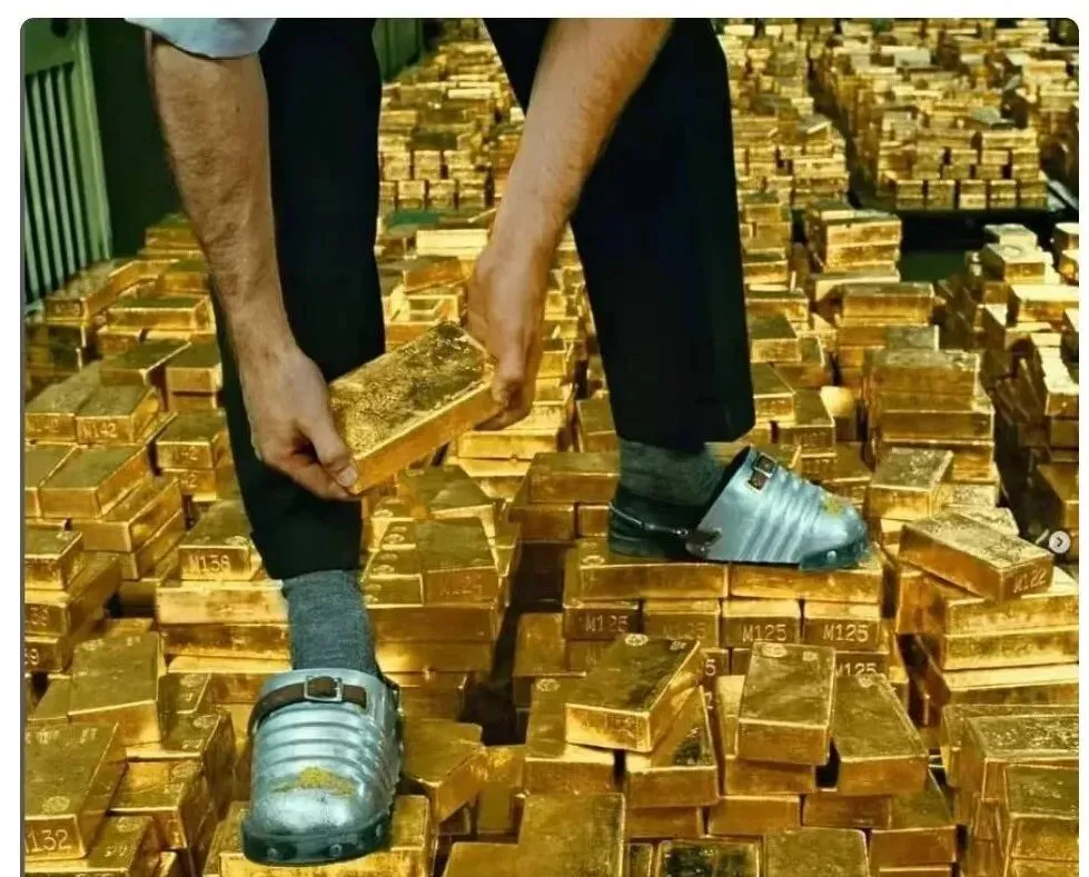 图中这一地闪瞎眼的是金条,编号一块一块码得齐,脚上那双金属鞋专门防砸,工人弯腰搬起一块,胳膊肌肉都绷出来,爸说金子沉得很,别看一小砖,分量像抱个孩子,现在手机里的数字跳来跳去,还是这堆实打实的金光最让人心安。