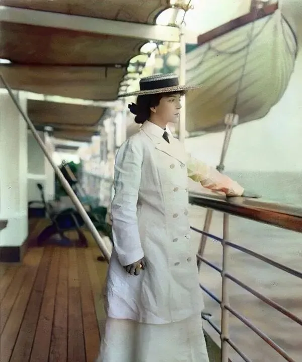 这个场景叫出海甲板,长风一过,篷布鼓起来,双排扣白呢大衣配硬边草帽,手搭在栏杆上,身子微微前倾,明显是盼着靠岸,我奶奶看到这张说,咱那会儿坐船可没有这讲究,裹件棉袄就上了,海风呛得人直抹眼泪,现在旅游一趟动不动就拍上百张,过去拍一回像,都是大事。