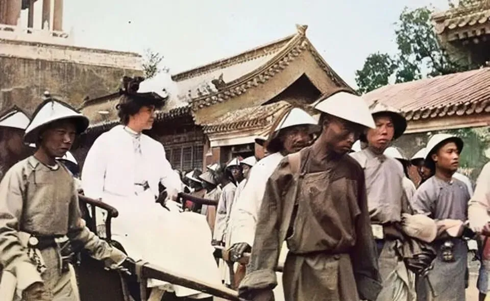 这个排场叫抬肩舆,两根木杠穿过轿身,前后各两名轿夫,头戴白盔样的遮阳帽,步子齐,一抬一起,轿里的人衣摆垂到踏板边,路过金黄琉璃瓦下,阳光一照,刺得人眯眼,这一段行程,可把围观的百姓瞧乐了,既好奇也犯嘀咕,谁能想到,有朝一日宫门对外宾敞开得这么大。