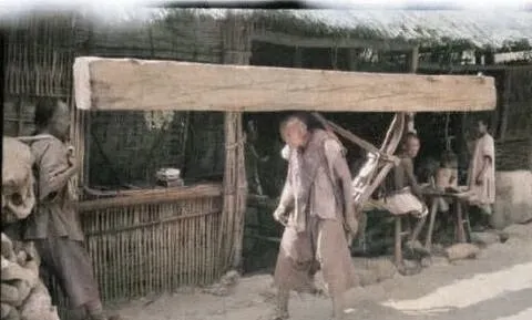 这活儿叫扛大料,木梁比人还长,前头挑在肩窝里,后头远远翘着,脚下尘土灰白,门口的伙计端着碗看他走过去,也没法搭把手,这份力气活,扛一次就知道什么叫喘不过气,男人腰往下一折,脸憋得通红,旁人只好目送,谁家都有自己的难呀。