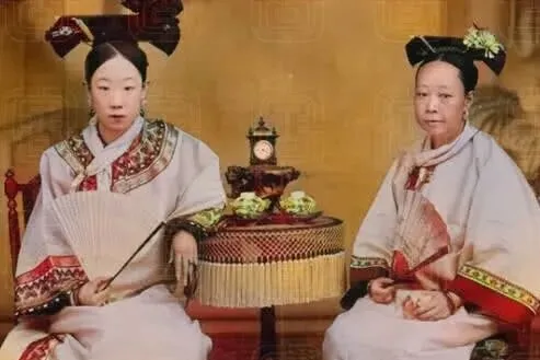 这个造型叫两把头,满族妇人的代表发式,发梳横着架,鬓边压得平平,袍子上绣团花,指尖夹一把团扇,桌上洋钟滴答,旧规矩和新玩意儿凑一桌,右边那位发际线偏高,神情却端正,坐姿笔直,妈妈说,打小学的就是体面两个字,家底够不够先别管,衣着坐相不能乱。