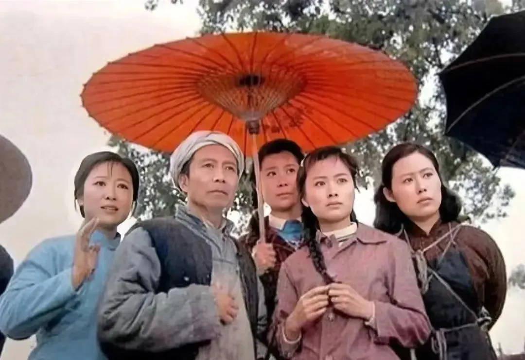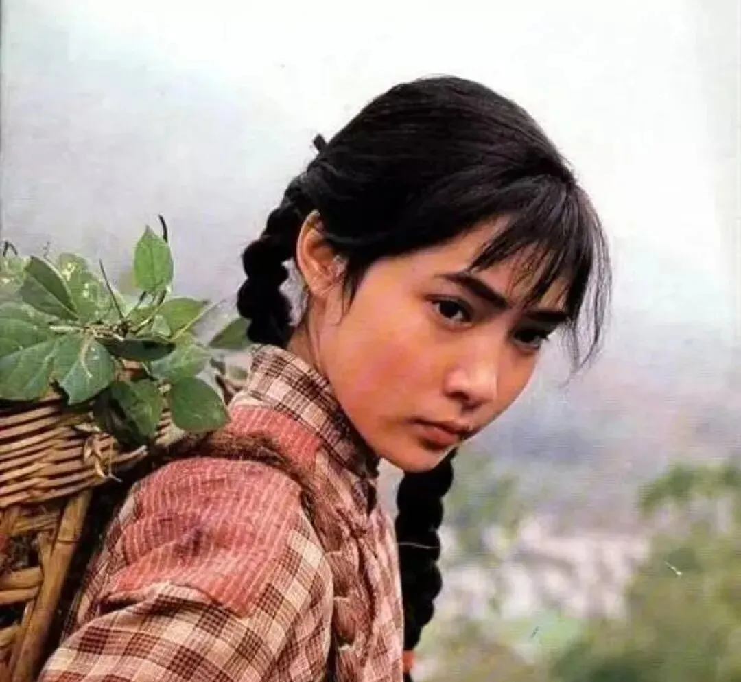 这位背着藤篓回望的姑娘,双辫子压着格子上衣,篓里青叶冒着新鲜气,眼神一挑就把整部戏的劲头提了上来,那时我们家楼下照相馆有一面同款格子布景,爱美的表姐非要学这张的角度,一拍就是一下午。