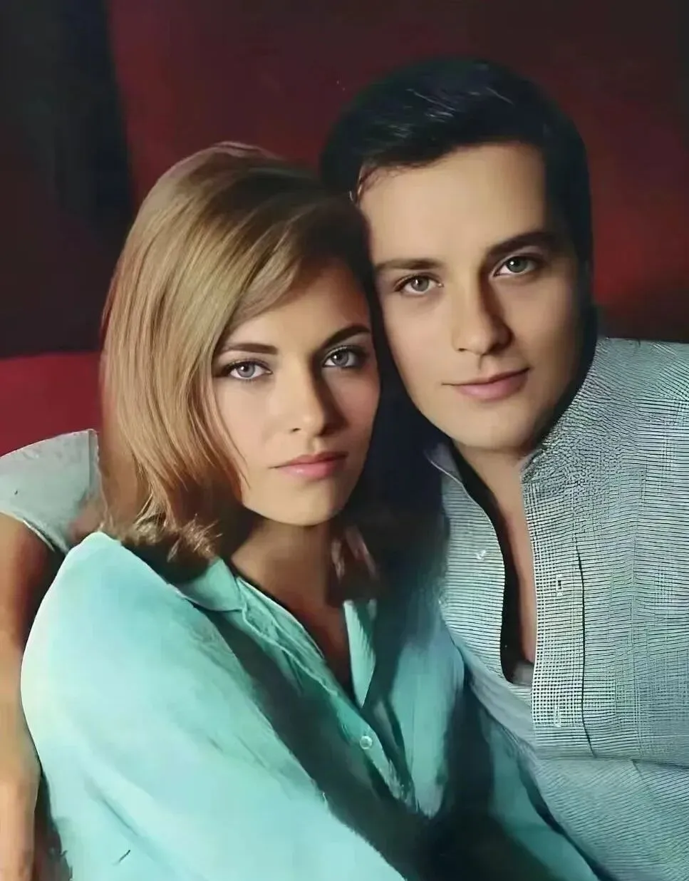 这对并肩坐着,靠枕是暗红,衣料是细密的棉纱,浅绿色在灯下泛着柔光,目光都很定,像在等快门落下的那一下,袖口的钮眼没系紧,露出一点点衬布边,细节处最见温柔,靠近一点就能听见呼吸打拍子的频率。