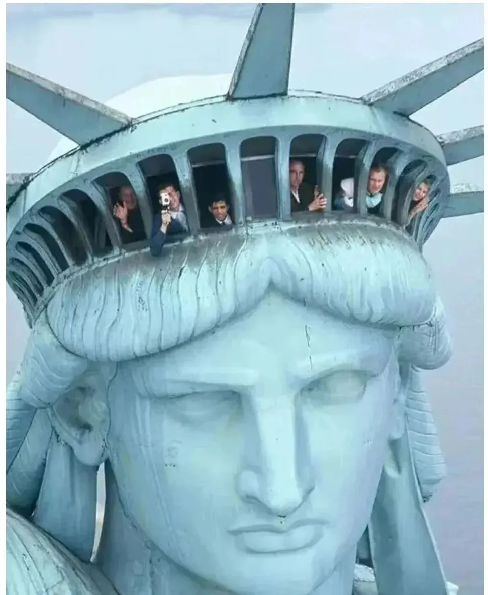 原来这座女神的头上真有窗,栏杆隔出一格一格的视线,游客把相机举在眼前,铜皮表面布满雨痕,发辫被固定成一道一道的纹路,风从海上钻进来,带着盐味和汽笛的声音,离得这么近,看她的表情倒像在沉思。