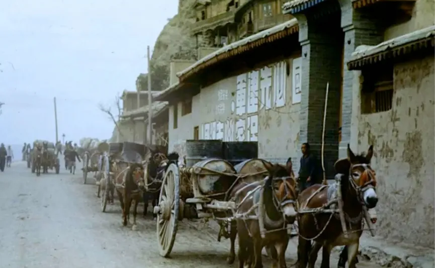 这个长串的车队叫骡车帮,木轱辘子高过膝盖,辘辘一转尘土跟着走,车辕上皮绳勒得紧,桶子里装的多是油盐和布匹,车夫身上灰布衣,肩上搭着短鞭子,一路没喇叭,全靠吆喝让路,我妈说小时候听见辘轳声就会站墙根看半天,现在公路宽得很,车声呼啦啦过去,谁还会停下来看一列骡车慢吞吞走。