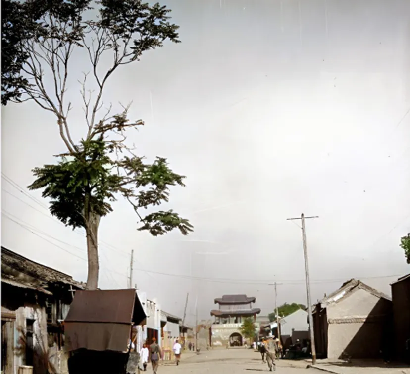 这个角度能看见远处的城门,近处一棵树瘦却立得住,木栅子靠着墙,屋顶盖着乱铁片,街上有人牵着车从容过去,风声里混着土腥气,外婆说以前出门记得带个布头,路上尘多,裹口鼻不呛,现在口罩一盒一盒买,原因却换成了别的,城门还在,过门的心气儿换了。
