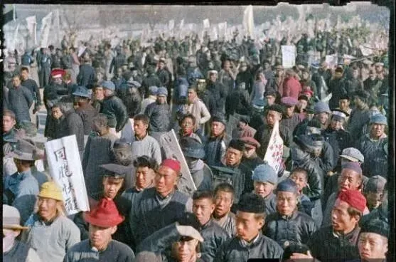 这个近景里的人叫游行队伍,蓝灰长衫是主调,间或点着红帽黄帽,脸上全是紧着的劲,牌子横着竖着都举在手里,字不工整,可一笔一画都是气,走起来肩挨着肩,谁也不肯掉队,我外公说他那会儿也是这么排着,脚底的土哗啦啦往后卷,现在我们开车过街一脚油门就过去了,那时每一步都算数。。