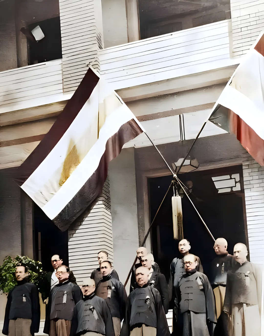 图中那面被举得高高的旗子,就是当年一些人用来装样子的“欢迎”标志,白底黑边,中间一团暗黄色的图案,旗杆交叉成个叉字,门口一排人衣摆齐刷刷垂着,麻布长衫发乌发亮,站姿倒挺端正,表情却像被风吹皱的水面,爷爷说,旗子一晃,心就凉半截,那时候人最怕的不是风,是风往哪边吹。