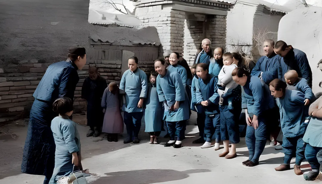 这个巷口场面叫地主回乡,土墙灰得像冬天的天,佃户们排成一溜,蓝袍子蓝裤子,弯腰不声儿,孩子跟在大人身后学样儿,地主拎着个小篮,身子前探,似笑非笑,奶奶说,以前地在他手里,话也在他手里,现在人手里有手机了,嘴上才敢多两句。