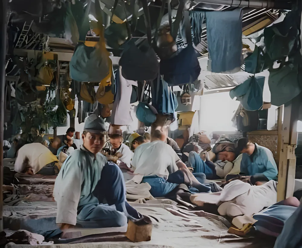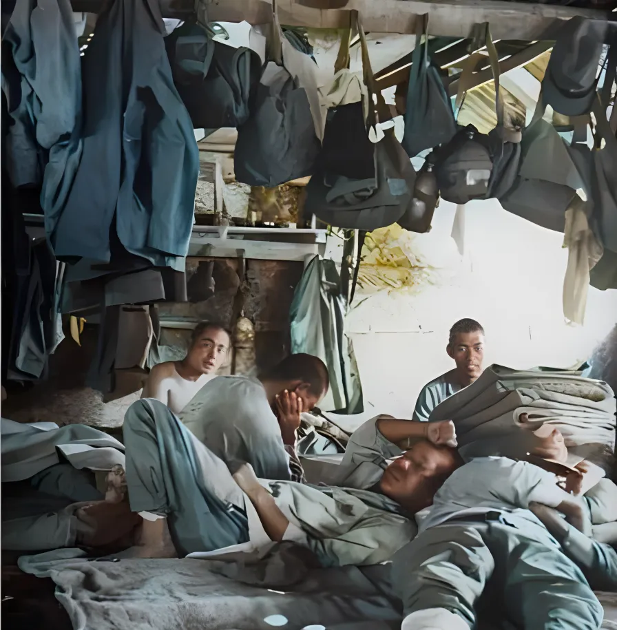 这间逼仄的屋子叫兵营窝棚,木架子上挂满布袋军衣,地上铺着毡子烂单子,几个人横七竖八倒着,枕头是叠起来的制服,窗缝透进来的光像刀背,小时候我在外婆家炕头午睡,翻个身都挑剔,这些人睁眼闭眼都在将就。