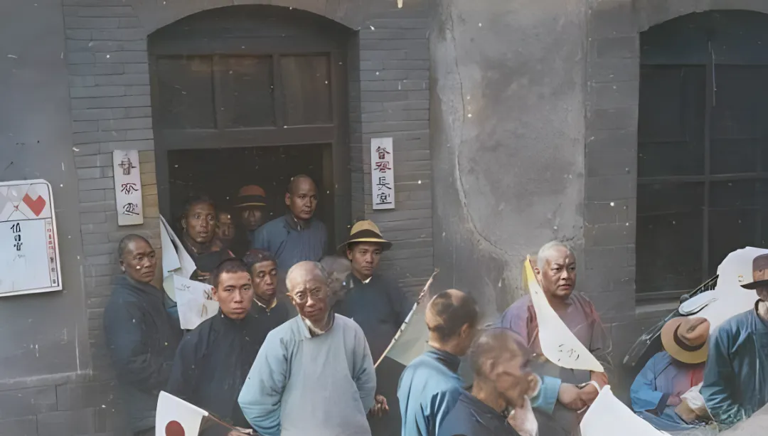 民国上色老照片:哈尔滨嫖客窥视挑选暗娼;胸戴红花士绅出资赈灾;汉奸准备欢迎鬼子入城。
