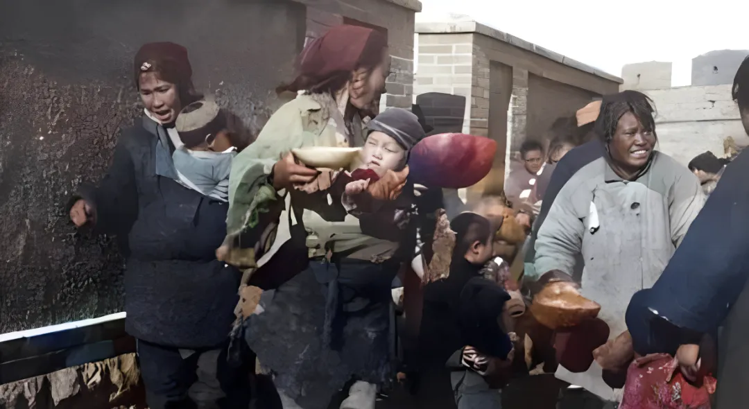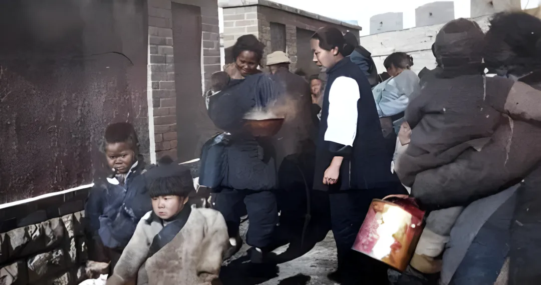 这两张是发粥,木盆里冒着白气,女人怀里抱着孩子,空碗端在风里抖,脸上糊着灰,又被热气一熏,眼睛立马就亮了一层,志愿的妇人端着桶在边上吆喝,快一点,别挤,碗给后边的也留着,外婆讲,那时候喝上一口热乎的,就是把一日的命接回来了。