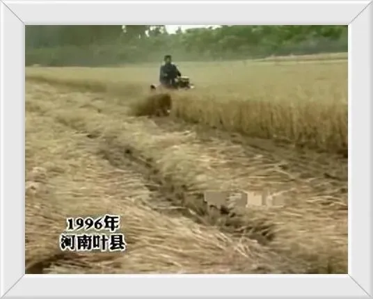 九十年代的麦田地里,人们在收割麦子,还是机械化收割。