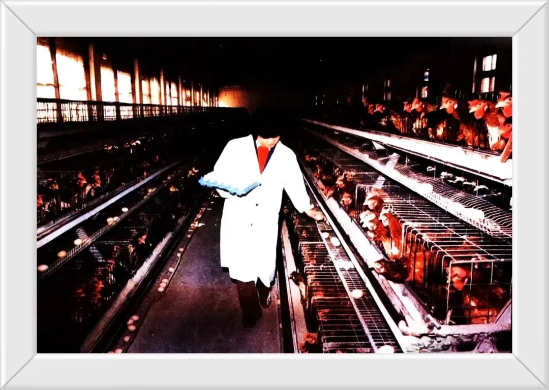 养鸡场。看工作人员正在捡拾鸡蛋,直接装盒进市场。