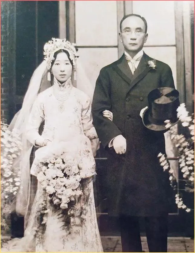 这是一对新婚.夫妇的合影,.光看新.娘的装束就知道不是普通人家。新娘.头上戴着精致的凤冠,身披洁白的婚纱.和传统刺绣礼服,手捧鲜花,颈间还挂着.层层叠叠的珍珠项链。那个年代能穿得起这样一身行头的,家.境必.定.殷实。新郎西装革履,手持礼帽,.一副知.识分子.的打扮。最有意思的是他们周围那些花篮,全是真花扎成.的,在那个物资匮乏的年.代,这样的婚礼排场.可不是谁都办得起的。
