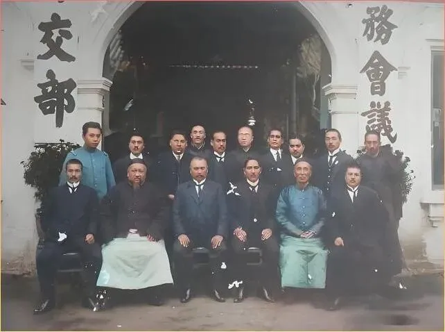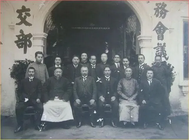 最后这张.照片最能说明问题.了.!还是这批人,但这次能看.清楚.背景上的大字——右边写着.务会办,左边是交部二字。结合前面的线.索,这应该.就是民国时期外交部办.事机构的集体照了。那个年代的外.交官员,个.个都是留过洋,读过书的文.化人,.西装革履是标.配,气质谈吐更是一等一的.讲究。你看照片里坐着的几位长者,一身长衫打扮,应该是.德高望重的前辈;站着的年轻人们,.清.一色的西装笔挺,这就是民国知识分子的真实写照。