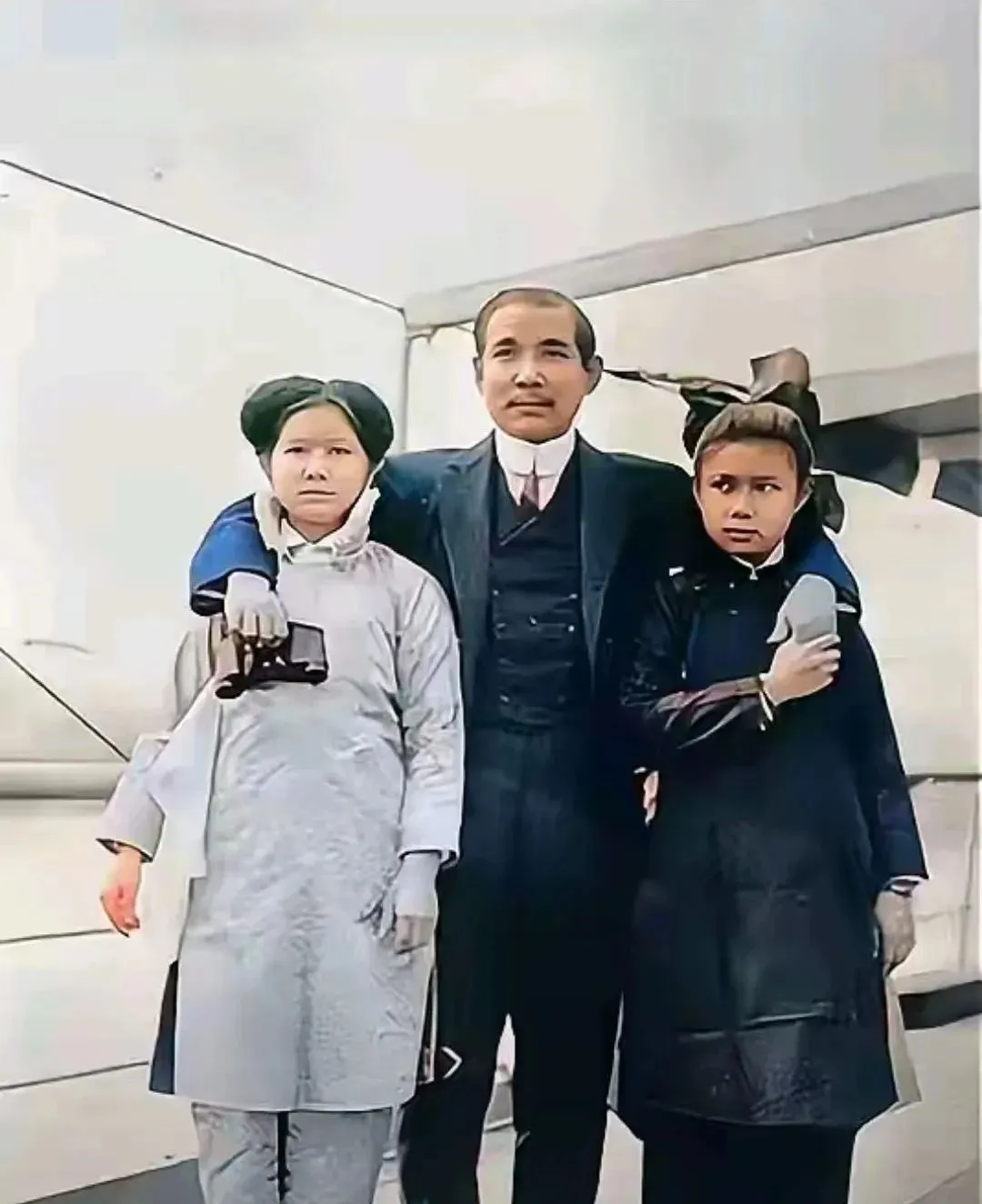 图中这张老合影最抓人的是站姿和眼神,一家人靠得很近,父亲穿深色长外套打着高领,左臂自然搭在亲人肩上,右侧的小姑娘扎着发带,紧紧抱着一只浅色披肩,背景像是停机坪边的舷梯,风一吹衣角微微鼓起来,镜头没有摆拍的紧张,更多是赶路间的从容,旧日家庭照大多如此,讲究站稳心定四个字。