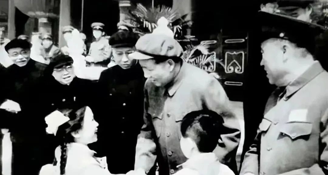 这个场景叫门前寒暄,黑呢大衣配棉帽的人微微弯腰,跟两个扎着蝴蝶结的孩子握手说话,后面人群围成半月,谁都没挡谁的视线,笑意挤在眼角里,奶奶说那会儿去街口看热闹,要踩着冰渣子小跑,回家鞋底全湿了也不在意,图里这种近距离的交流,现在在城市里可不多见了,隔栏杆隔安保,连打个招呼都得远远挥手。