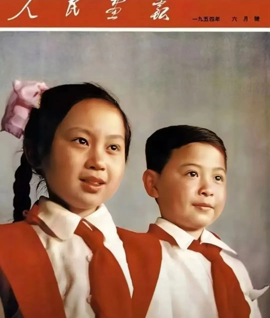 这个就是画报封面,红底标题一压,两个少年前襟打得很齐,系带笔挺,皮肤上还亮着杂志棚灯的光点,当年书摊上一摆,风一过哗啦啦翻页的声音很干脆,妈妈说那会儿她存了三张粮票去换一本,回家把封面撕下来压在玻璃板下,书桌立刻就显得正经了。