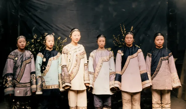 这个排排站的队形叫大户人家的妻妾合影,宽大的对襟上衣把肩膀全包住,袖口一圈一圈的滚边亮得很,绣线密密匝匝,颜色从淡粉到靛蓝都有,脸上粉打得匀,发髻油亮,整个人像被规矩托着站定,外人看着以为都体面,家里人清楚,名分是把秤,轻重都在上头压着,妈妈说老辈子娶妻先看门第,再看脾气,模样反倒往后站一站,等到纳妾才把好看不看放到前头,这话搁现在听着也拧巴,可那时候就这么走。
