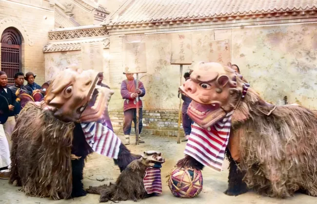 这对毛茸茸的大脑袋叫舞狮,嘴边的牙咧着,彩球在地上滚,皮鼓一擂,狮头一俯一抬,灯笼红在旁边晃,人群一见动静就围了过来,孩子把手伸进狮嘴里求个吉利,鼓点越敲越紧,狮子对着球一蹭一扑,旁边的小狮跟着学样,师傅说过年舞狮是讨个祛邪纳福,扮狮的人憋在里头满身汗,出来一抹脸全是黑道子,那个热闹劲儿啊,到了夜里还在耳朵边打回声,现在广场上也有表演,音响一开更响,可那股子土气和人味,得在旧屋檐下才能闻到。