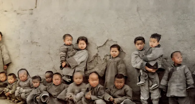 这墙根下一排排的孩子叫村里的娃娃们,衣裳是灰的,裤腿是短的,鞋面上补丁一块压一块,右边的小姑娘抱着弟弟,脚上裹着小脚,站也站不稳,眼神却倔,爷爷说那时家里忙,谁大一点谁就先顶上,喂火煮粥抱孩子,能做什么就做什么,等到开学的鼓一响,能去的去,去不了的在家帮大人,那会儿识字是稀罕,现在孩子书包一个比一个鼓,午后还得报兴趣班,想想墙根这队小脑袋,心里就被戳了一下。