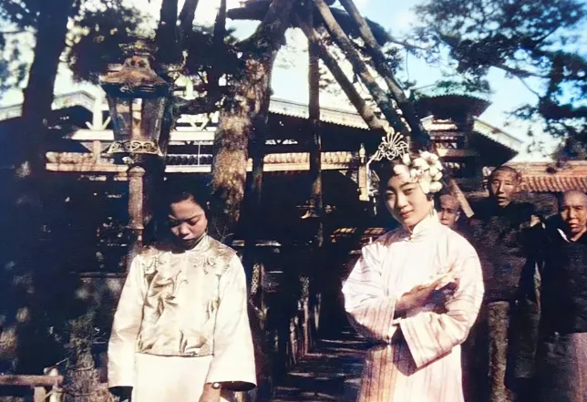 最后这张里两个身段清秀的女子,一个低着头,一个嘴角压着笑,这个合影在当时叫主妻与侧室的照片,头上的簪花一簇簇,云肩压着粉衣,树影在背后打成碎块,光景看着好,心事不在脸上,听大人讲起她们的事,唏嘘里全是内宅的门道,屋檐里最锋利的是沉默,一个人多说一句就多走一步,主家的脸面是天,旁人的呼吸得跟着转,那时候女人的路窄,现在回头看,照片上的笑也显得薄。