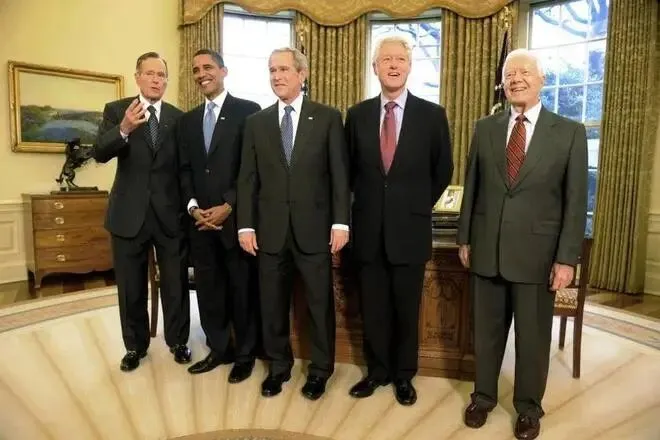 上图可能是为数不多的五位老美总统的合照,从左至右老布什、奥巴马、小布什、克林顿、卡特。