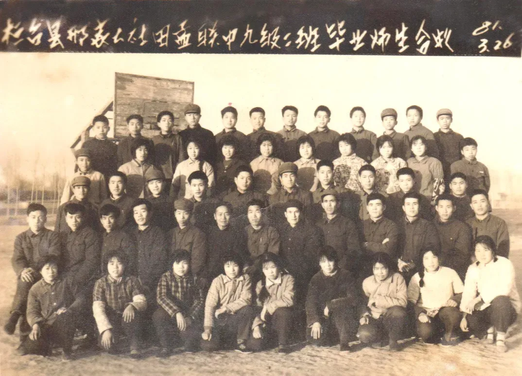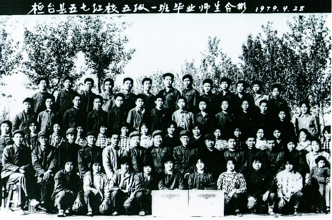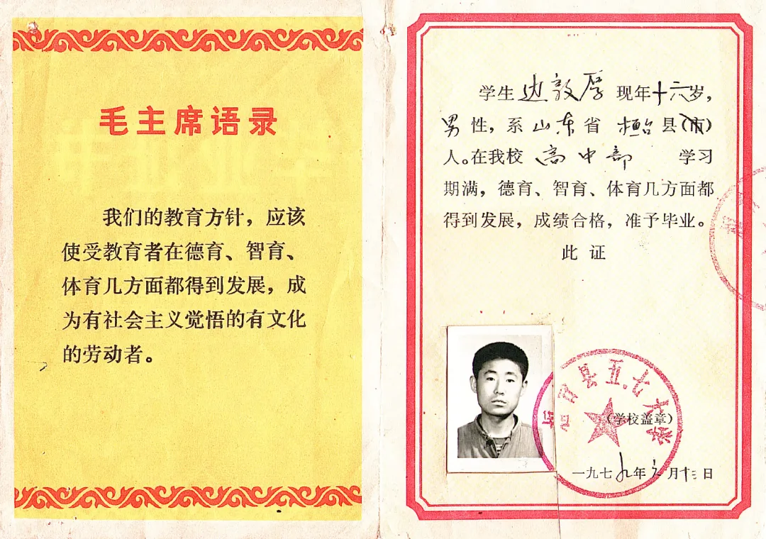 1969年12月,桓台县第一农业中学、第二农业中学与桓台县农场合并更名为“桓台县粮种繁育场五七红校”。1972年,场校分开,学校更名“桓台县五七红校”。1978年,经山东省革命委员会批准,“桓台县五七红校”更名为“桓台县五七大学”。从1973年开始,“桓台县五七红校”开始招收两年制高中,每年级两个班,主要招收果里、侯庄两个人民公社的学生。上图为“桓台县五七红校”五级(共三个班)一班毕业师生合影。第二排左六为副校长尹红军、左七为校长张希福、左八为副校长任曰俭、左十为教导主任尹德尧。第四排右一为班主任张侠老师。后排左五为照片提供人边敦厚,高级工程师、国家注册一级建造师。下图为照片提供者的毕业证,上边的印章为“桓台县五七大学”。(照片提供者:边敦厚)