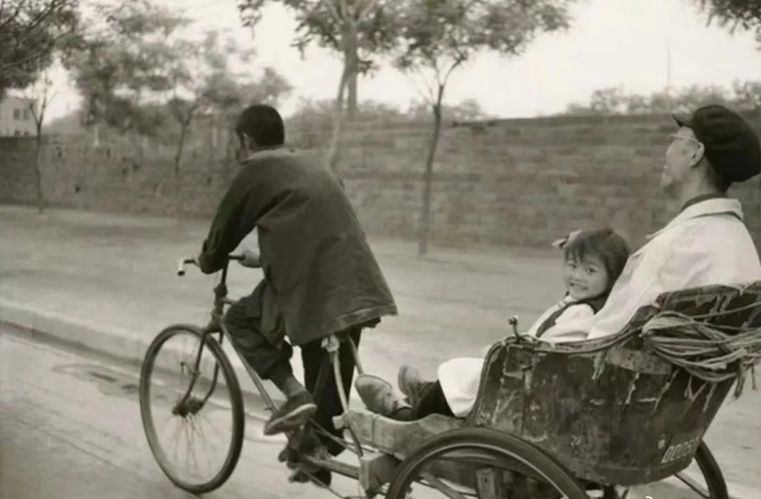 画面里,一辆改装的三轮载客车碾过平整的路面,骑车人俯身蹬踏的背影沉稳有力,车厢内的老者头戴前进帽端坐,身旁小女孩的笑脸在黑白光影里格外明亮,背后是连绵的砖墙与初发新叶的行道树,将建国第七年的北京风貌,凝练成一幅兼具历史厚重与生活温情的纪实画卷。
