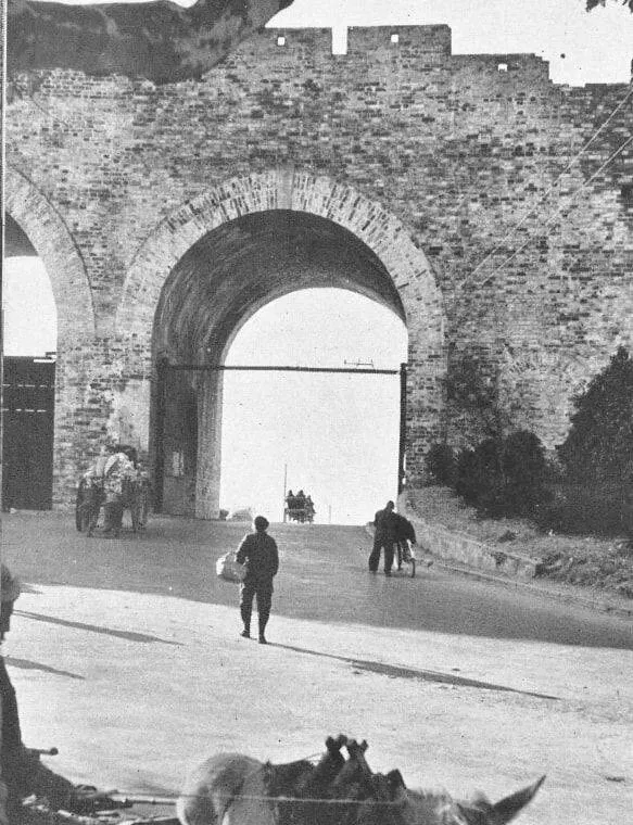 图中这道厚实的砖石拱洞叫城门,砖缝里白灰斑驳得像老树皮,门洞高挑,马车能并着进,门边常有人靠墙歇口气,挑担的人从阴影里穿过去,脚步声被弧形的穹顶回一回,听着特别清爽,城门外面亮得刺眼,像是另一个世界。